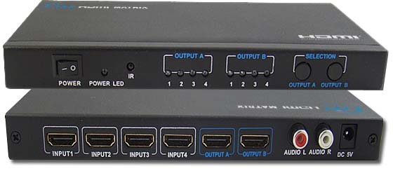 Esta matrix HDMI 4 entradas e 2 saídas é um equipamento que distribui qualquer uma das 4 fontes de entrada para um dos 2 monitores, e pode funcionar como um divisor de vídeo e mostrar a mesma fonte em 2 monitores simultaneamente com resolução de 1080p e 3D.